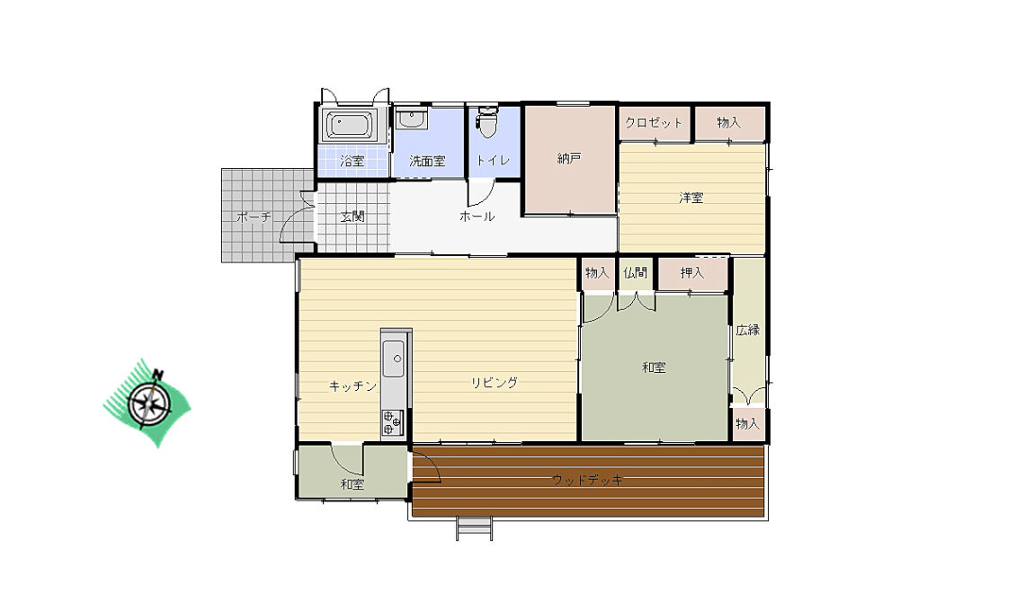 間取り 2LDK+納戸 建物面積 97.30m2(約29.43坪) 土地面積 600m2(約181.5坪) 築年数 平成21年6月23日 新築